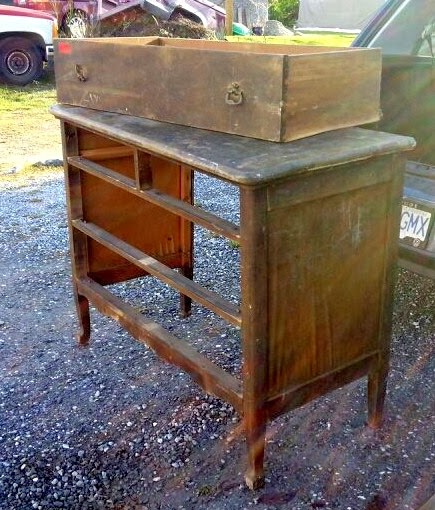 It was a dark and stormy night and this little woe-begone of a dresser stood idly by the side of the road. He had been deserted and left there for what seemed weeks or longer. He couldn't say for sure. All he knew was that he was cold, wet, and his old tired boards were warped. He was about ready to give it up. When what to his weary and wondering eyes should appear? A lady to save him and ease his fear. Who was this woman on a saving mission? It was none other than Che from Juxtaposition. She saw his condition and had her suspicion, that with some ambition, she could ease his transition. (That's it for the rhyming. I'm all out.)